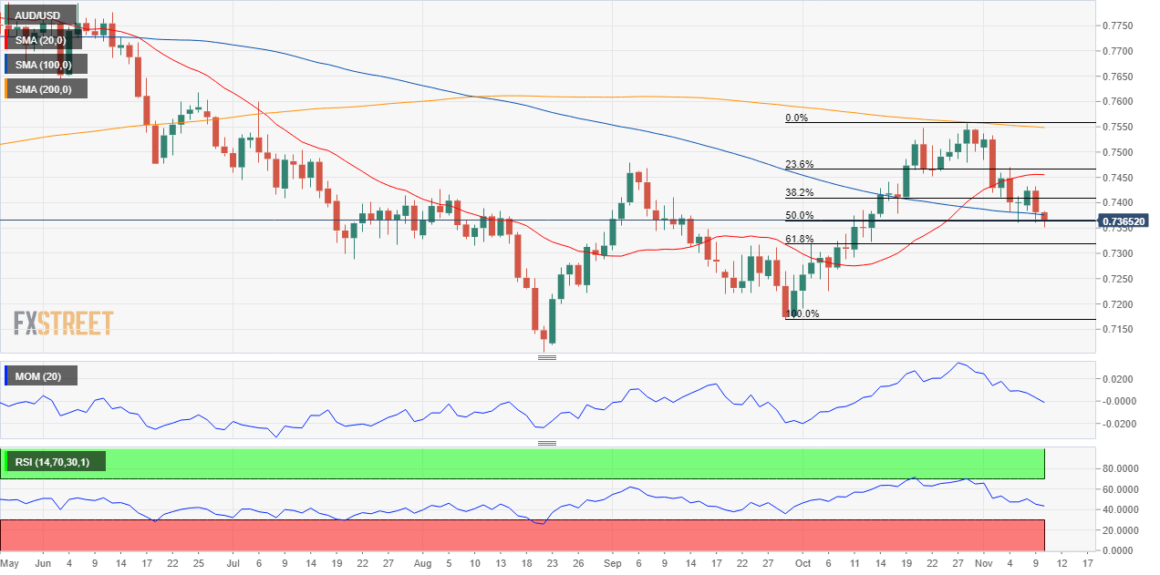 The AUD/USD pair is on the losing side ahead of Australian employment figures, extending its slide from the 0.7555 multi-month high posted in October. The ongoing decline is linked to the market’s risk-off mood amid inflation-related concerns weighing on equities. A disappointing report could exacerbate the slide while the report needs to be much better than anticipated to force the pair into a U-turn.