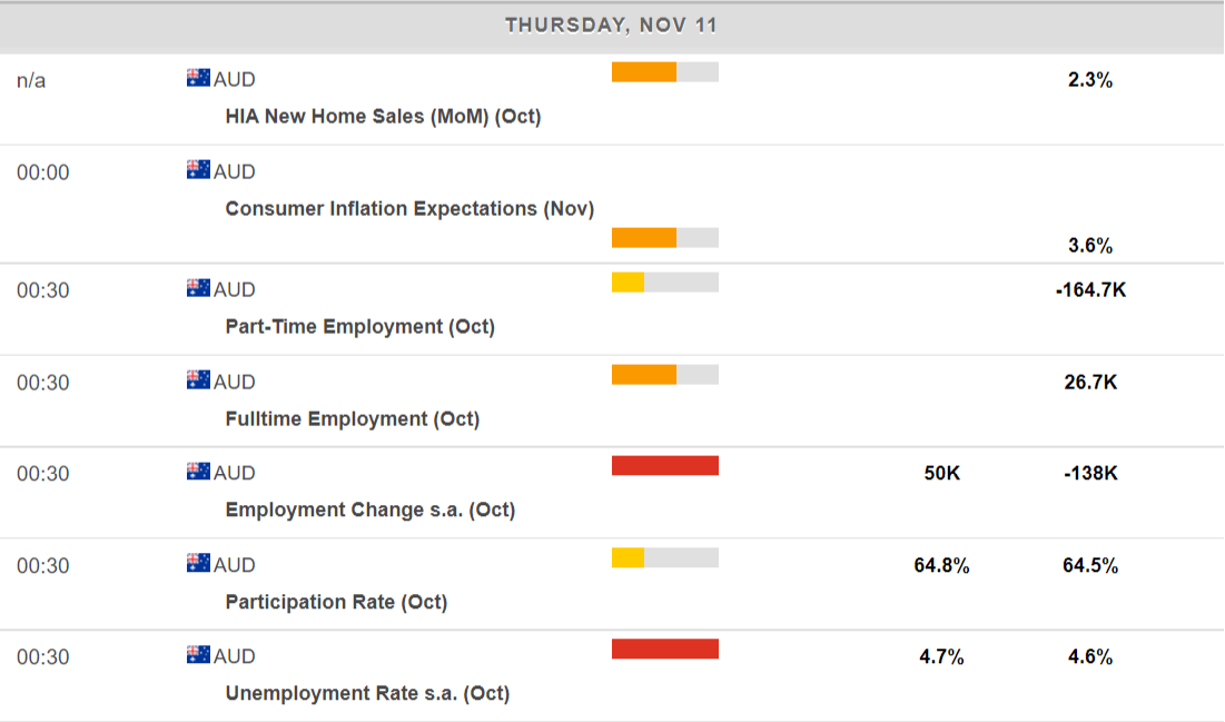 - Australia is expected to have added 50K new jobs in October amid partial reopenings.
