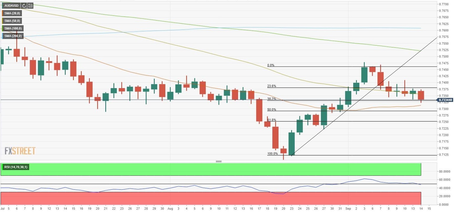 At the time of press, AUD/USD is trading near the Fibonacci 38.2% retracement level of the latest uptrend at 0.7330. Below that support, the 20-day SMA aligns as interim support at 0.7315 ahead of 0.7300/0.7290 area (psychological level, Fibonacci 50% retracement) and 0.7250 (Fibonacci 61.8% retracement).