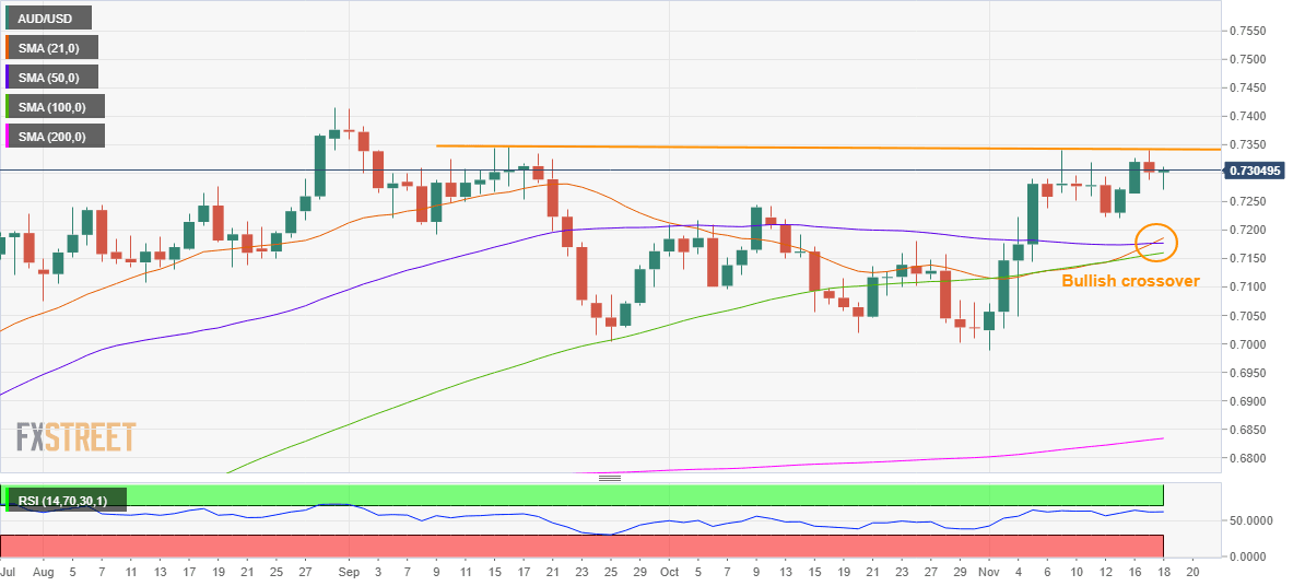 The broader market sentiment, amid rising coronavirus cases and vaccine hopes, could also have an impact on the aussie’s reaction at the time of the data publication. Although, the bullish crossover on the daily chart suggests that the upside appears more compelling in the near-term.