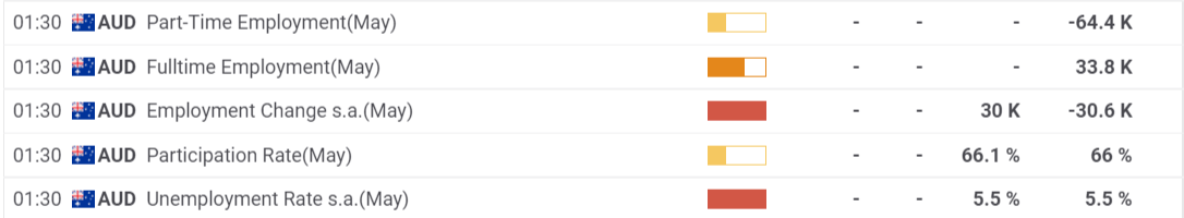 Australia will report May employment figures this Thursday. The country is expected to have added 30,000 new jobs in the month after losing 30.6K in the previous month. The Unemployment Rate is foreseen steady at 5.5%, while the Participation Rate is seen ticking up to 66.1% from 66% in the previous month. Back in April, the country added 33.8K full-time positions but lost 64.4K part-time ones.