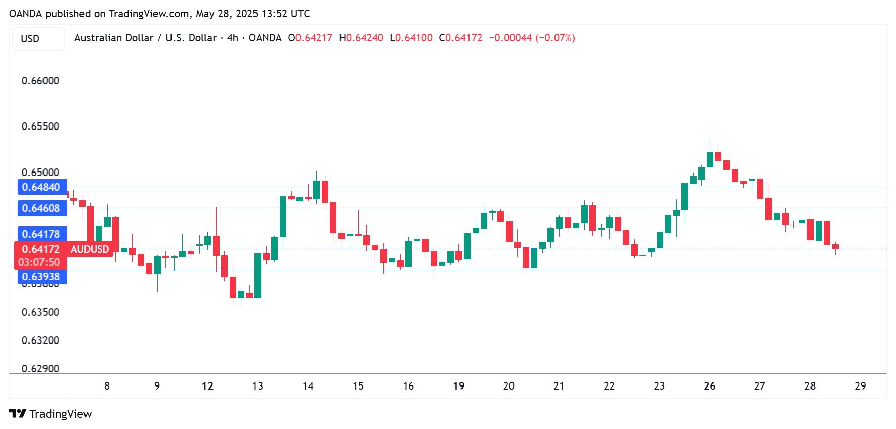 AUD/USD is testing support at 0.6417. Below, there is support at 0.6393.