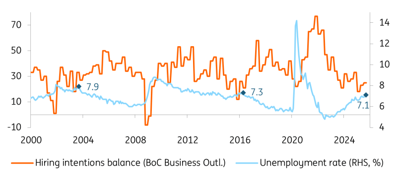 Lingering trade-induced uncertainty continues to weigh on Canadian activity and carries risks of broader jobs market deterioration. We expect the BoC to overlook higher-than-expected jobs and inflation data and cut by 25bp on 29 October. The door may be left open to more easing, and CAD should remain vulnerable against most of the G10.
