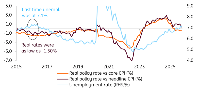 We expect a hold in December, followed by one final cut of 25bp in January, bringing the policy rate to 2.0%. This might look excessively loose, especially relative to the Federal Reserve, but it actually aligns with historical BoC real policy rates, which have often been negative.