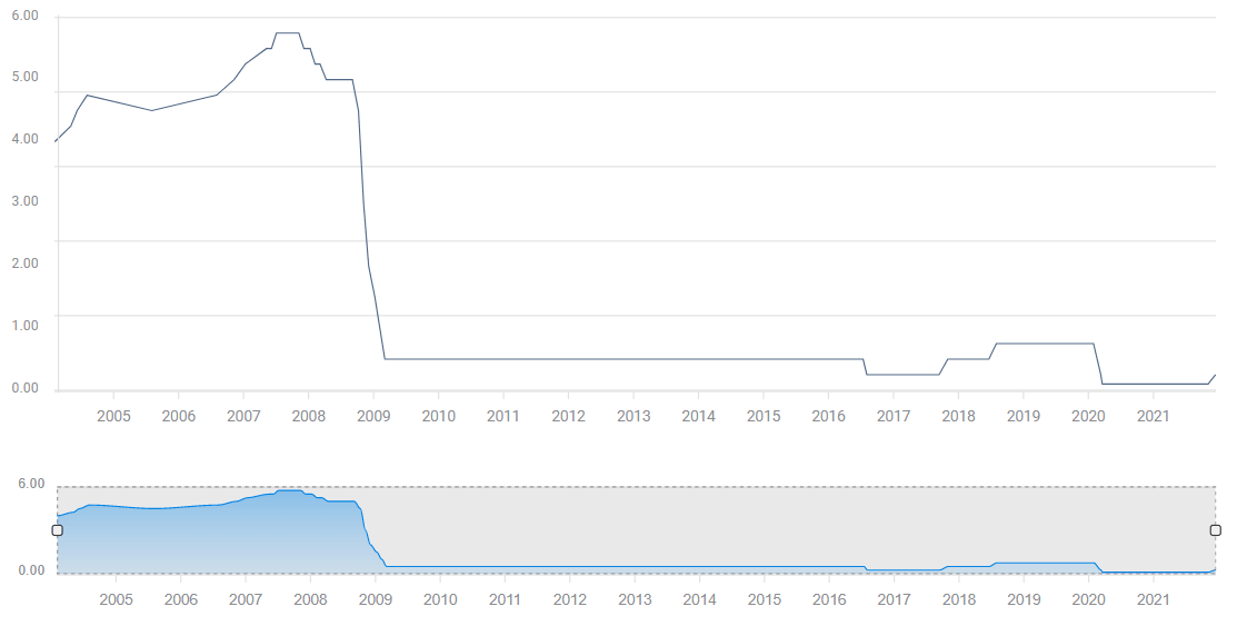 In December, the bank became the first to pull back its COVID accommodation when it raised its base rate from 0.1% to 0.25%. Another increase to 0.5% is widely forecast for Thursday's Bank of England (BoE) policy meeting. This is the rate at which the bank has said it will begin unwinding its portfolio acquired over the past decade. The base rate was 0.75% in January 2020. These would be the first consecutive rate hikes since 2004.