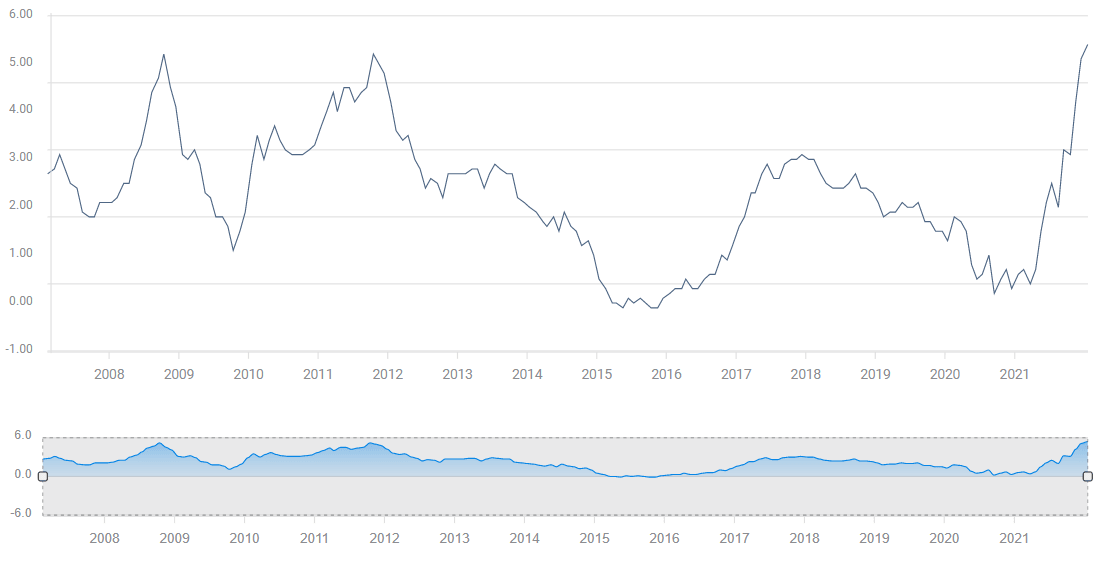 The UK Consumer Price Index (CPI) has multiplied over seven times in a year, from 0.7% in January to 5.4% in December. Core prices have soared three times, from 1.4% to 4.2%.