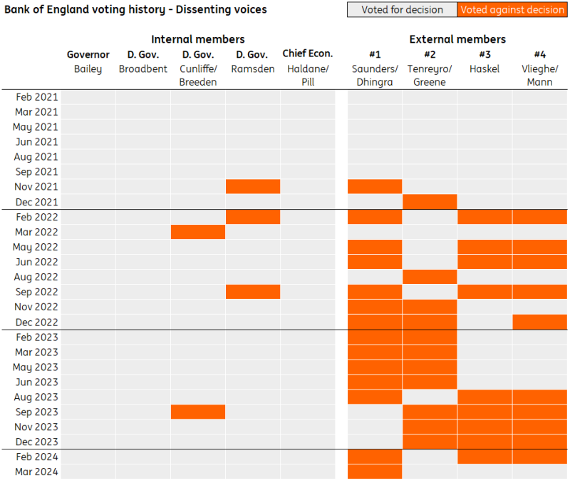 In other words, we shouldn't read too much into the rate split this month. If no internal member votes for a rate cut this month, history suggests that nothing is stopping all five of them from voting for a rate cut in June or August.
