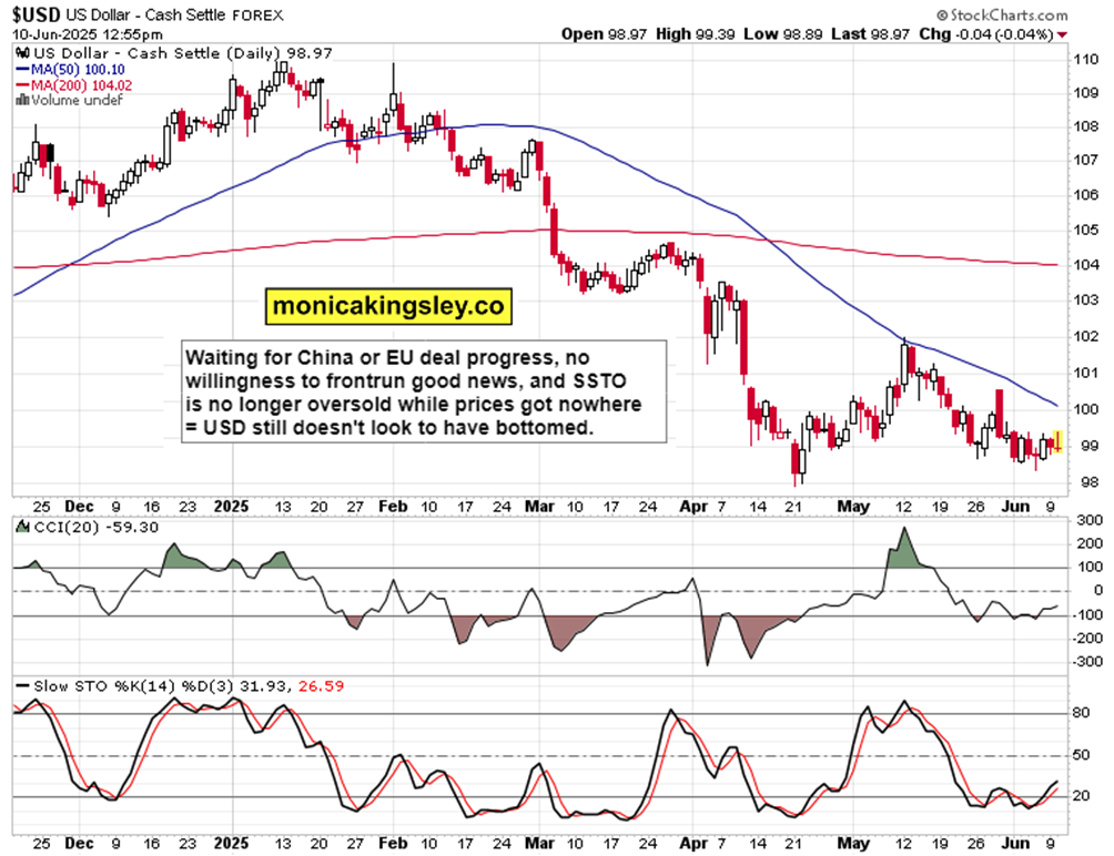S&P 500 didn‘t get far yesterday, but my leading index brought clients a dozen pts of intraday gains before it got hit too. Friday‘s momentum talked with clients before the open the same day ruled still early Monday – for now, market breadth isn‘t flashing signs of broadening. The trade talks with China aren‘t getting dramatically towards resolution, so it‘s more about describing what is happening and when vs. concrete achievements that are still very much in the making (I expect no fast breakthrough). TSLA is (very much) vulnerable to downswing here, PLTR, AAPL even NVDA are a little tired pushing higher at the moment, so the goal for the bulls is to get through the CPI tomorrow, ‘nuff said.