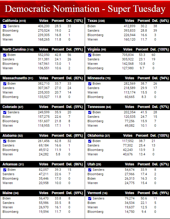 Despite spending upwards of $400 million of his own money, former New York Mayor Michael Bloomberg seems to have made little headway with the Democratic primary electorate, garnering just 27 delegates for an average cost of $15 million apiece. Massachusetts Senator Elizabeth Warren came in third in her own state at 20.7% of the vote behind the winner Biden with 33.7% and Biden at 27.0%.