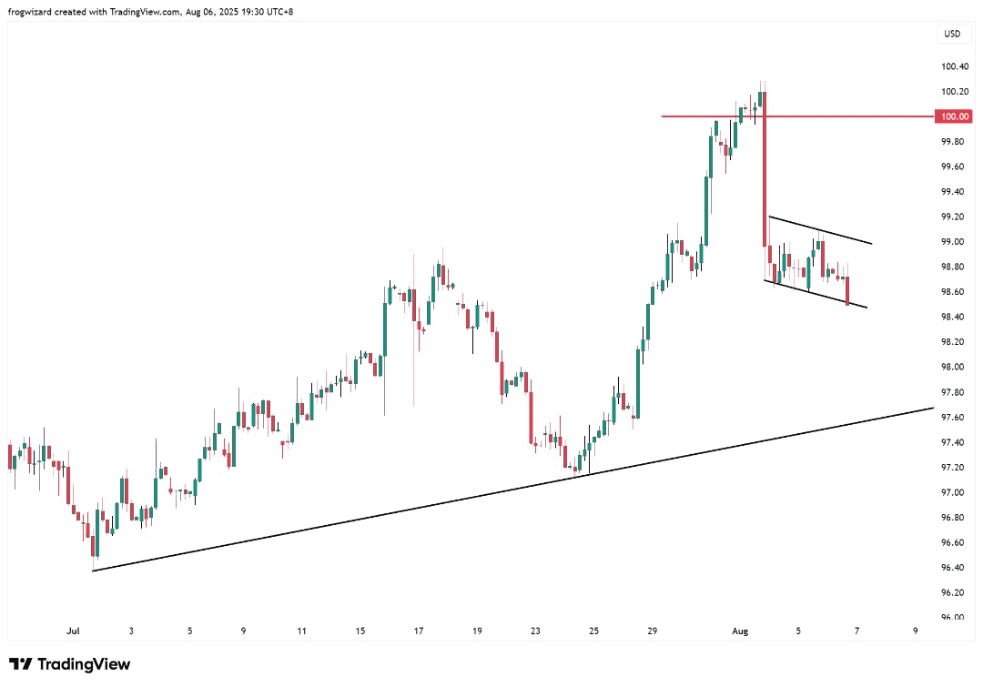 This week, price broke below the lower edge of that flag near 98.60. That breakdown adds technical weight to the bearish macro outlook.