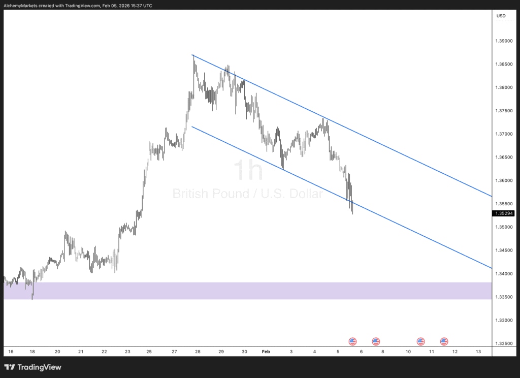 The 4-hour chart shows the pair trading inside a clear descending channel, now sitting around 1.3536. This pattern signals that sellers remain in control for now.