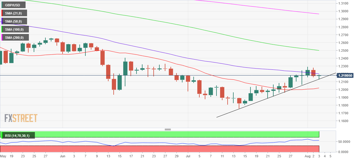 At the time of writing, the GBP/USD spot is at a critical juncture, challenging the critical daily support line at 1.2130 while capped by the bearish 50 DMA at 1.2200. The 14-day Relative Strength Index (RSI) is holding within the positive territory, keeping buyers hopeful.