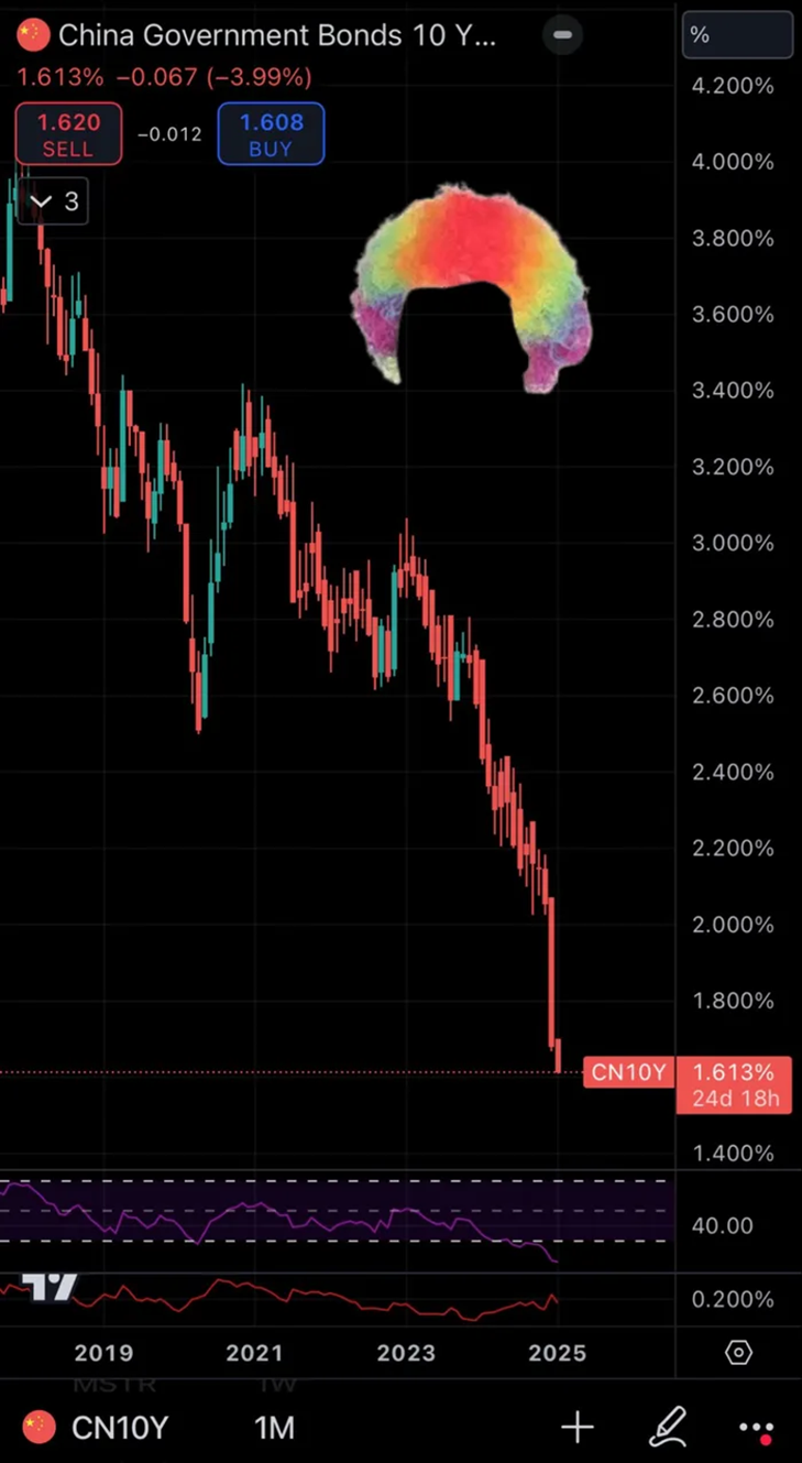 Here's something you don't see every day: China's central bank is actually fighting against their own bond market rally. Chinese 10-year government bond yields have crashed to just 1.613%—so low that the People's Bank of China has been forced to stop buying bonds entirely.