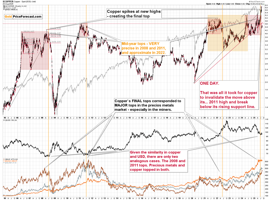 Copper also broke decisively below the rising red support line – the breakdown is now more than verified. Technically, copper is poised to plunge.