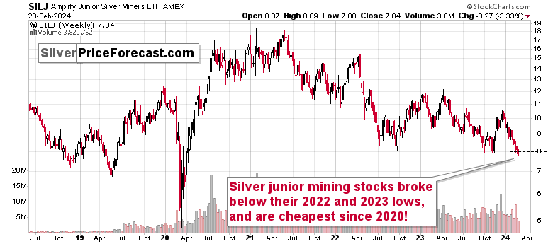 Once caveat here – if the stock market plunges, silver juniors could plunge too, and reach their 2020 lows without bigger pullbacks.