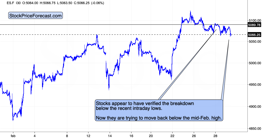 The S&P 500 Index futures moved below their initial lows, which could have been the first of many breakdowns. Right now, stocks are testing their breakout above the mid-Feb. highs. If they invalidate this breakout, the follow-up could be bearish, then very bearish, and then extremely bearish (I mean the subsequent waves down that could get bigger in each case).