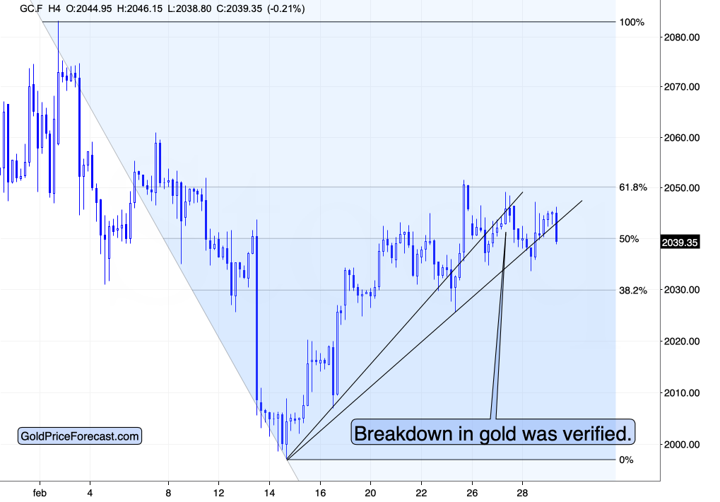Gold price recently verified its short-term breakdown and now is breaking below another – lower – support line.
