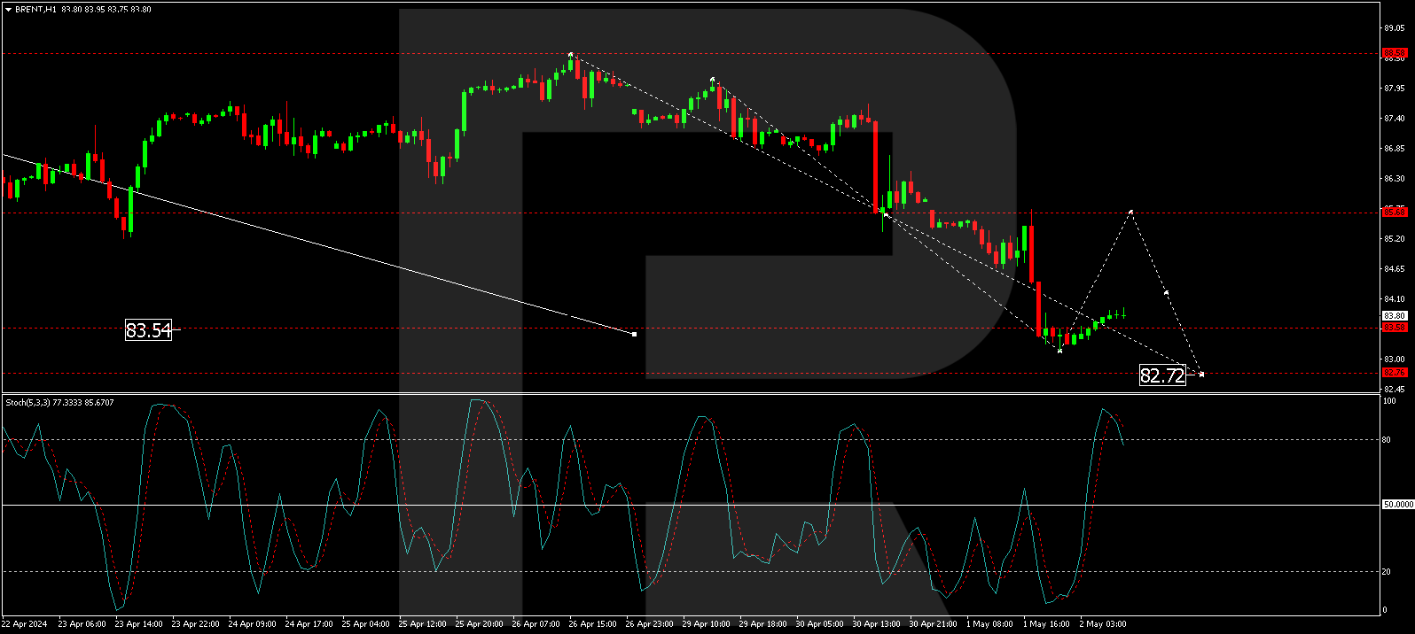 On the H1 chart, a fifth correction structure is developing towards $82.72. Once this target is achieved, a growth phase to $88.58 is expected, marking the first target of the new growth wave. This outlook is corroborated by the Stochastic oscillator, with its signal line currently above 80 and poised to descend to 20.
