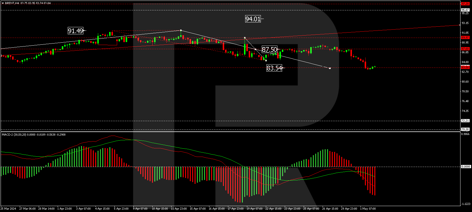 On the H4 chart, Brent oil has formed a consolidation range around the $87.50 level, with the current correction wave extending downwards. The price has already reached $83.50, and a further stretch to $82.82 is possible. Upon completing this correction, a new wave of growth towards $88.60 is anticipated, potentially continuing to $95.00. This bullish scenario is supported technically by the MACD indicator, whose signal line is below zero, suggesting a forthcoming update of the lows.