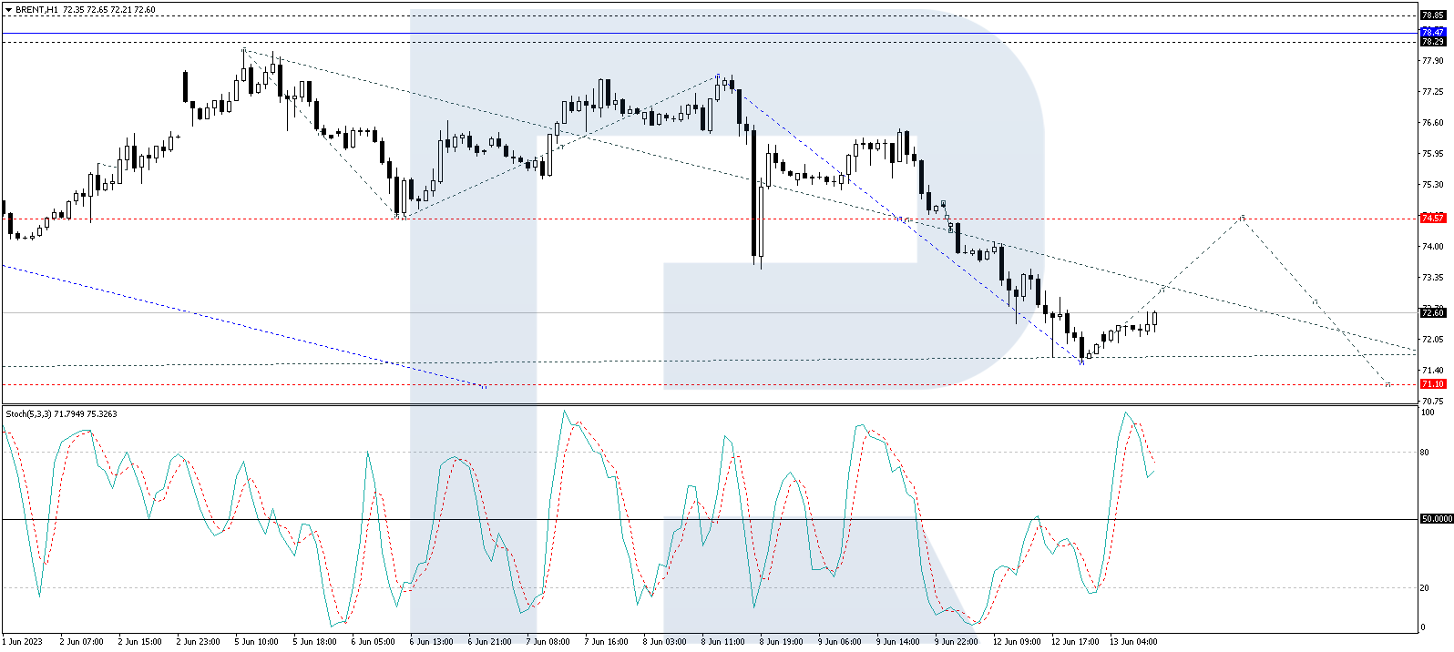 On the H1 timeframe, Brent crude oil is currently following an upward wave structure towards 73.10. Once the price reaches this level, a downward correction towards 72.30 may occur. Subsequently, if the price reaches the 72.30 level, a further rise towards 74.55 is anticipated. Technically, this scenario is confirmed by the Stochastic oscillator, as its signal line continues to decline towards 50. Once it reaches this level, an upward movement towards 80 is expected to begin.