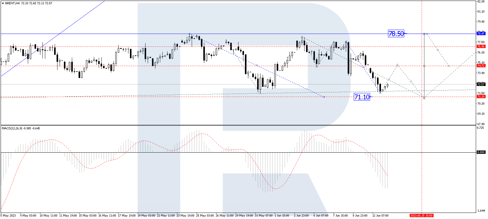 On the H4 timeframe, Brent crude oil is currently forming a wide consolidation range, centered around 74.55. However, the market has extended this range downwards to 71.55, indicating a potential for further correction. Today, we expect to see a potential upward movement towards 74.55, which will be tested from below. Following this, a downward trend towards 71.10 and subsequent upward movement towards 78.50 cannot be ruled out. This is the initial target. Technically, this scenario is supported by the MACD indicator, as its signal line is currently below zero and preparing to exit the histogram area, suggesting potential price growth.