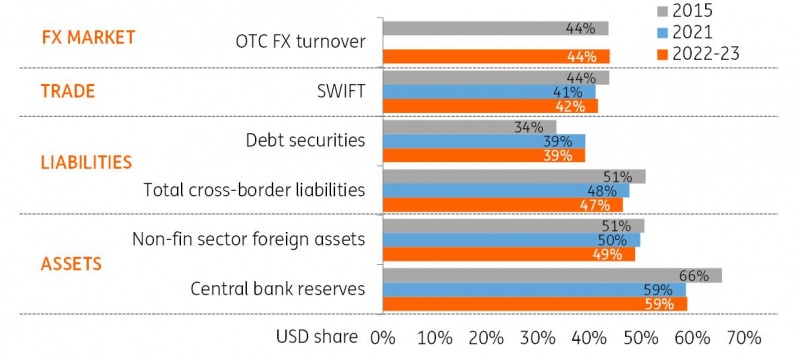 While we find this a useful framework to assess the extent of de-dollarisation, we prefer to examine the challenge to the dollar’s dominance through the three key areas: