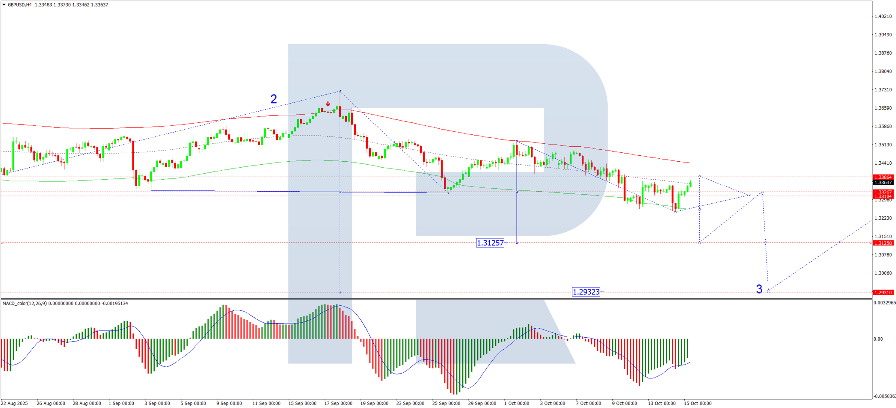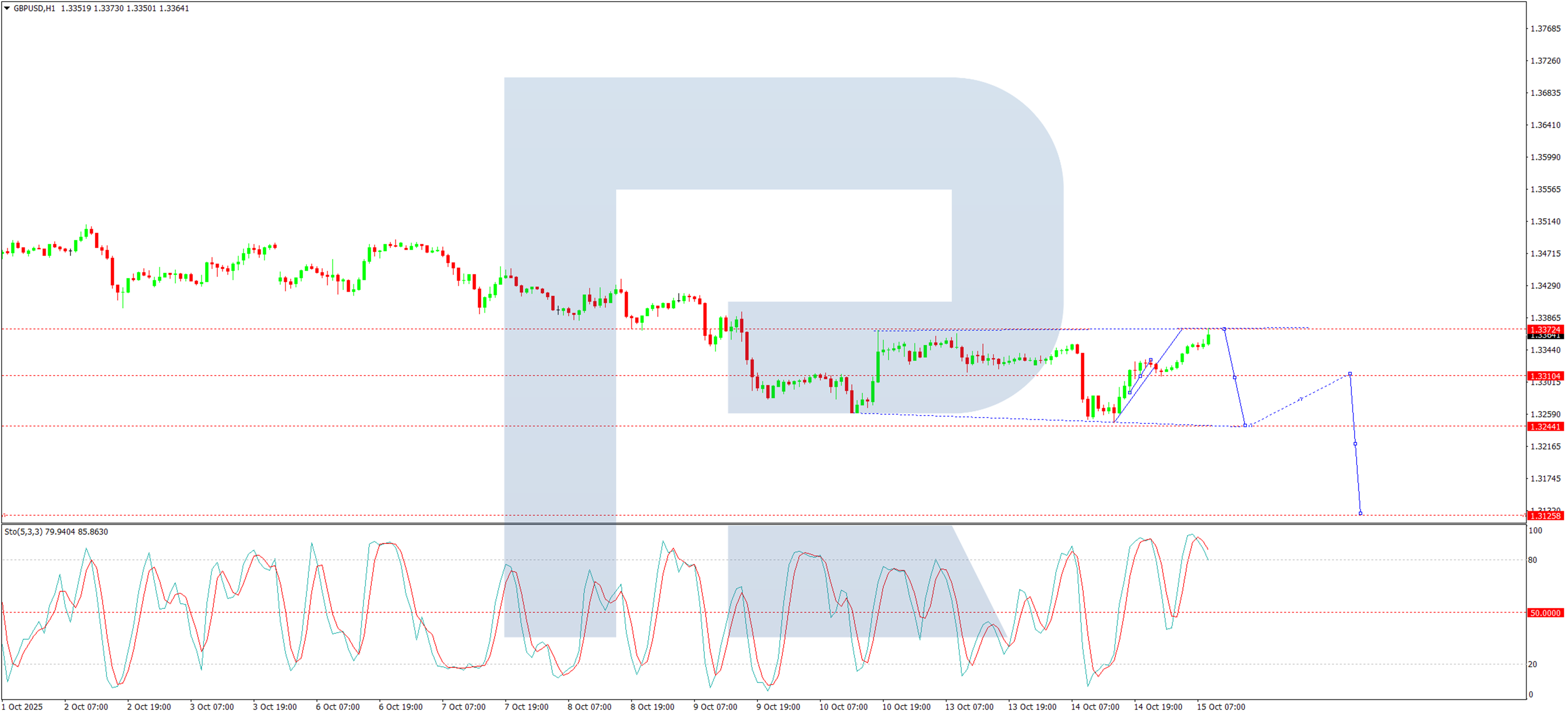 The pair has also formed a consolidation range around 1.3310, with the third wave of the broader downtrend now largely confirmed. The first leg of this wave reached 1.3252, followed by a correction to 1.3372. A further decline toward at least 1.3244 is anticipated, with an extension of the downward structure to 1.3125 also possible. The Stochastic oscillator confirms this scenario, with its signal line below 80 and trending downward towards 20.