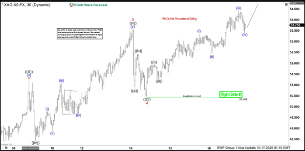 Silver then launched into wave 5, characterized by a five-wave internal structure. From the wave 4 low, the metal advanced in waves ((i)) to $51.93 and ((ii)) to $51.28 low, with minor sub-waves in waves (i) ended at $53.36 high and (ii) ended at $52.42 low. Up from there, wave (iii) ended at $54.42 high and wave (iv) at $53.40 low. Now as long as Silver stays above $50.40, dips are likely to attract buyers, potentially in a 3, 7, or 11-swing sequence, supporting further upside. This outlook suggests the bullish trend remains intact, with potential for additional gains as the impulsive structure unfolds.