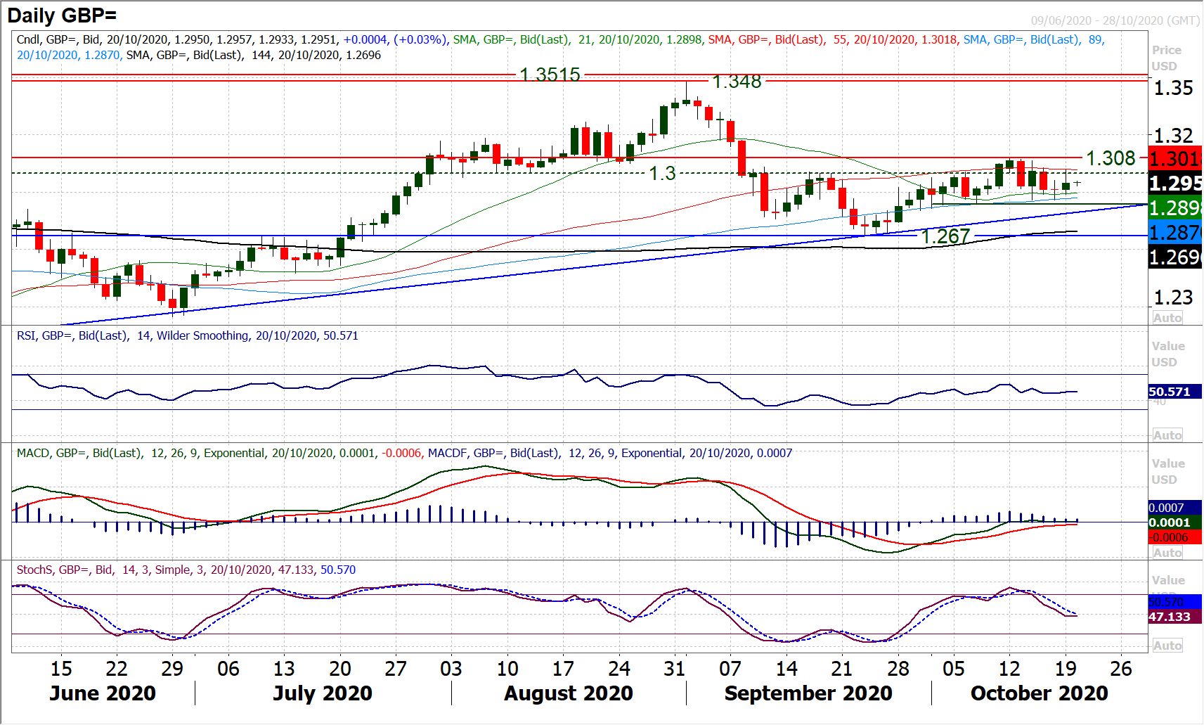 Elevated levels of intraday volatility are still a feature of Cable trading right now. Once more we saw a rally into 1.3000 failing to hold yesterday and Cable dropping back -75 pips into the close. It is indicative of the constant swing back and forth not only of USD expectations but also on GBP with uncertainty over Brexit trade deal developments. Cable is subsequently stuck in a sideways range. Support has developed at 1.2845 but the rallies have faltered between 1.3000/1.3080 repeatedly over the past six weeks. Trading within a clutch of neutral moving averages, we also see RSI and MACD momentum indicators almost dead neutral. It looks that is will be a newsflow driven breakout for Cable, so we watch US fiscal stimulus and Brexit trade deal developments again.