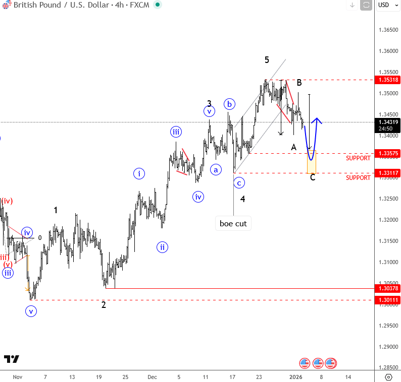 Cable traded higher for most of December, but during the holidays we saw some reversal, which is very normal when markets slow down. At the beginning of the new year, we can expect more choppy price action, with moves in both directions, before the market potentially stabilizes and maybe even resumes higher later on. From an Elliott wave perspective, I would not be surprised to see a deeper near term retracement within the ongoing A-B-C decline. The first support comes in around 1.3357, followed by the 1.3300 area, which is an interesting zone as it marks the post Bank of England rate cut low.