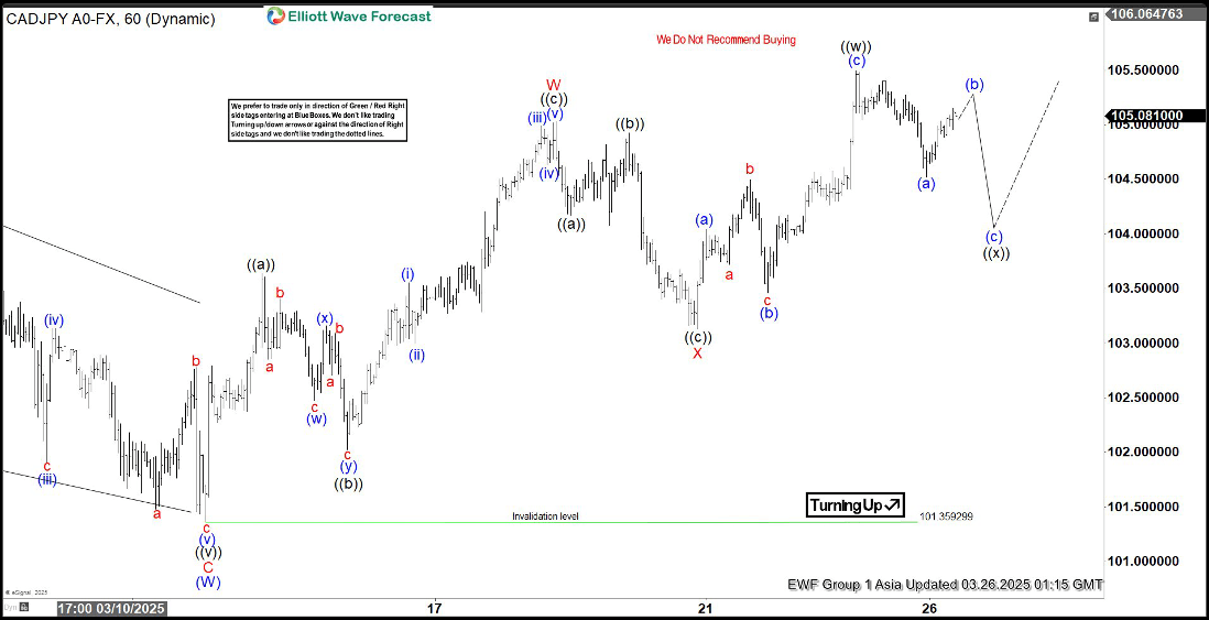 Short term Elliott Wave view in CAD/JPY suggests pair ended cycle from 11.20.2024 high in wave (W) at 101.35 as the 1 hour chart below shows. Pair is looking to correct cycle from 11.20.2024 high within wave (X). Internal subdivision of wave (X) is unfolding as a double three Elliott Wave structure. Up from wave (W), wave ((a)) ended at 103.64 and pullback in wave ((b)) ended at 102.02. Wave ((c)) higher ended at 105.029 which completed wave W in higher degree.