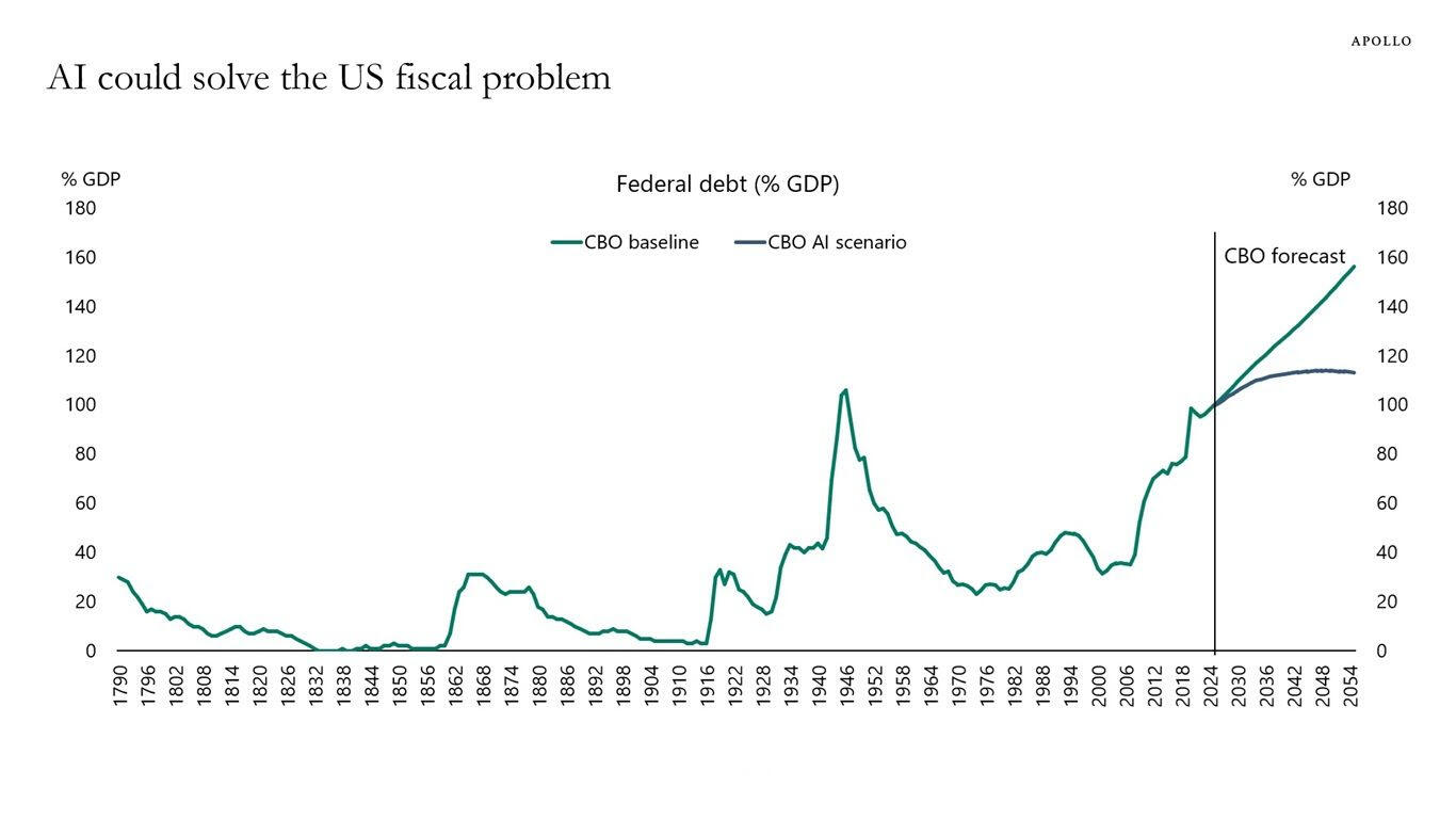 This is not so far-fetched. In fact, the Congressional Budget Office estimates that if AI results in permanently lower inflation, it could solve the US fiscal problem.