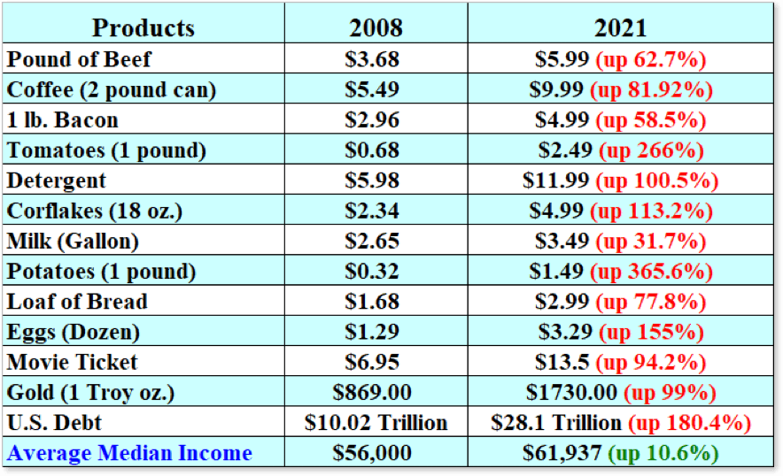 This brings us back to the headline of this article, how much less will your money buy in goods and services in the next 10 years. To get an accurate read, first we have to see how much dollar has declined in value in a more recent history, say the last 13 years. So let’s have a look at prices for a basket of goods from 2008 through today: