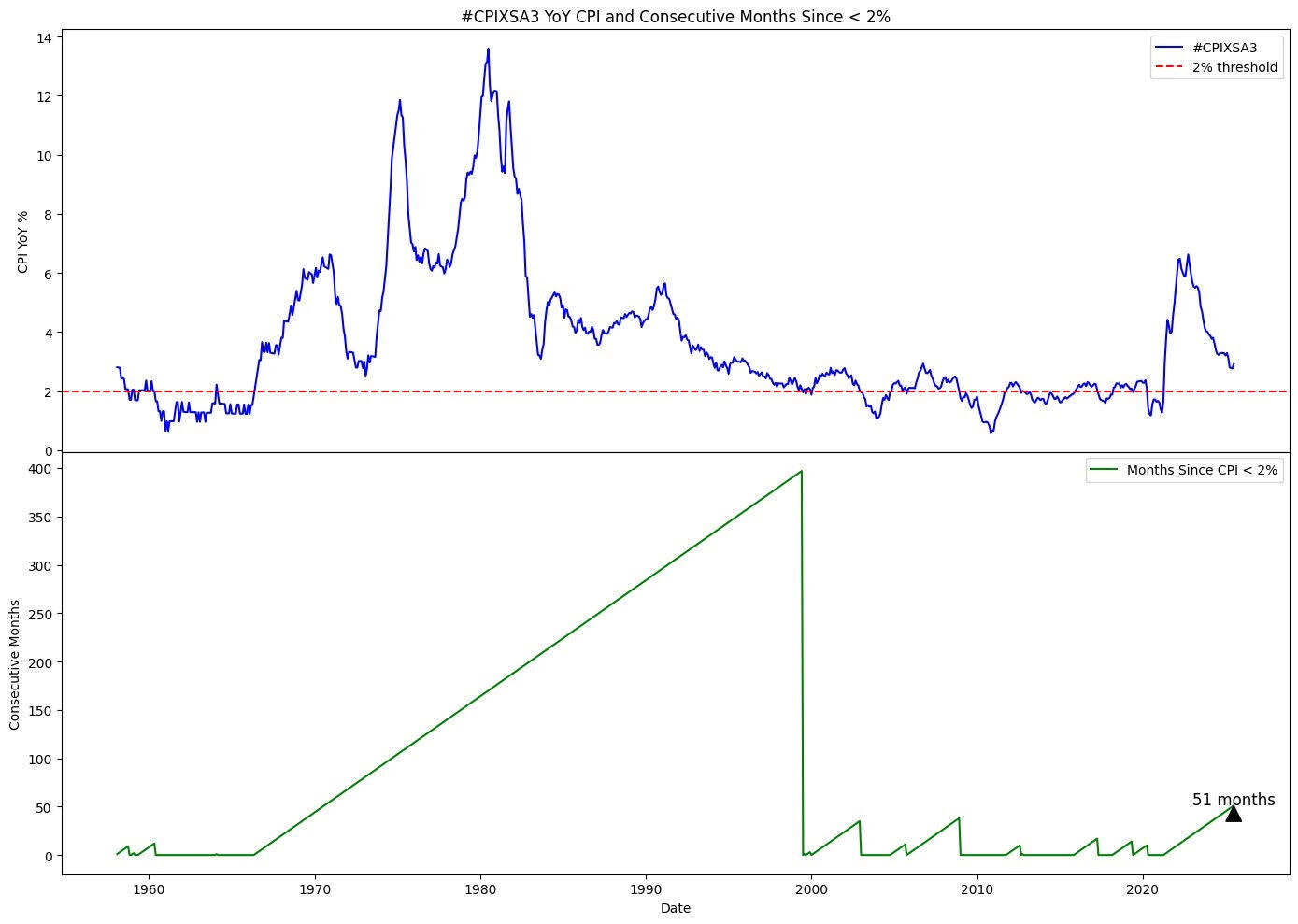 It has been 51 months since the US Core Consumer Price Index has been equal to or below 2%, which is the Fed inflation target. Who wants to place a bet on whether we beat the record at 400 months?