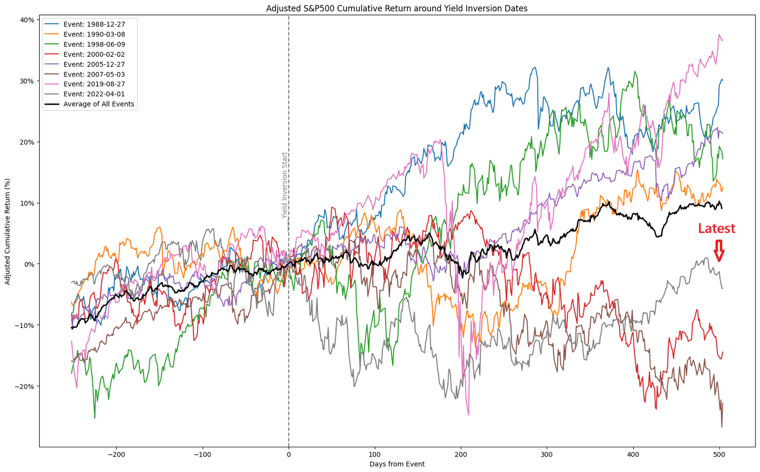 I ran some before-and-after analysis; the average inversion has been good for the market, contrary to what economists expect for the economy. The most recent post-inversion return was slightly below the averages. Perhaps not what most would have thought.