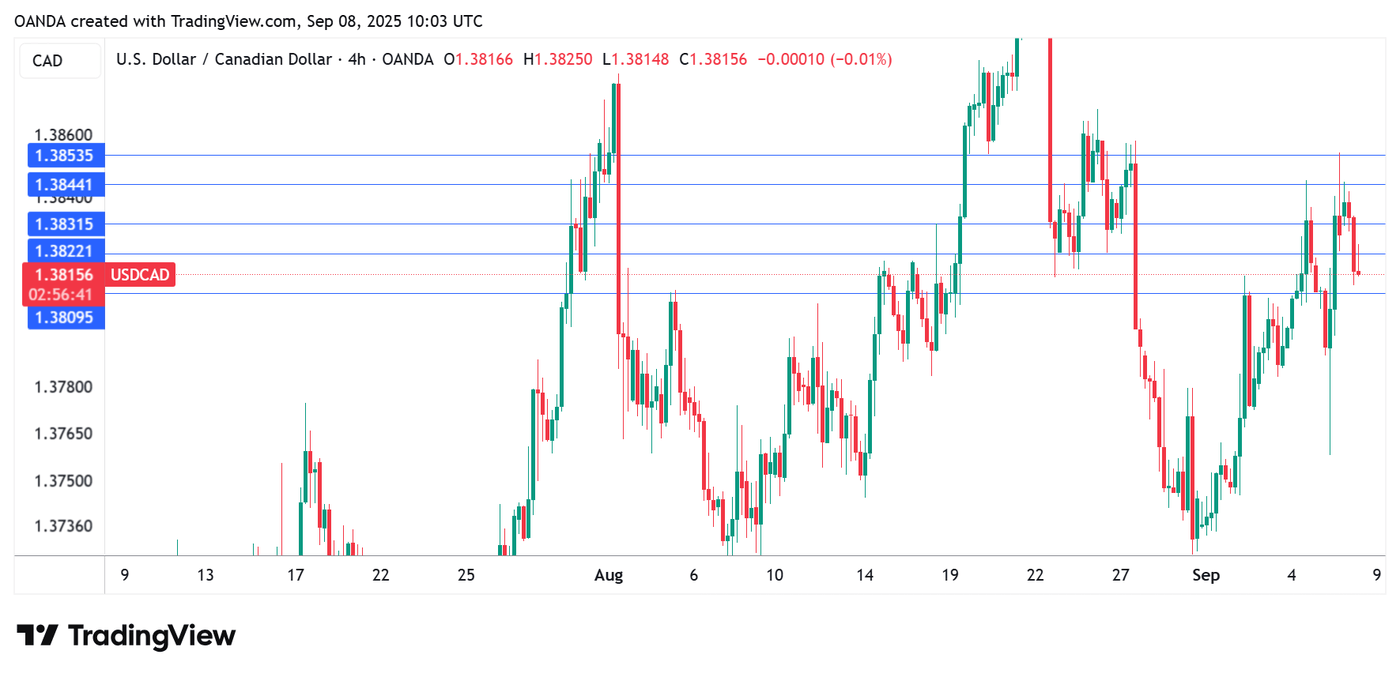 - USD/CAD has pushed below support at 1.3830 and is testing support at 1.3821.