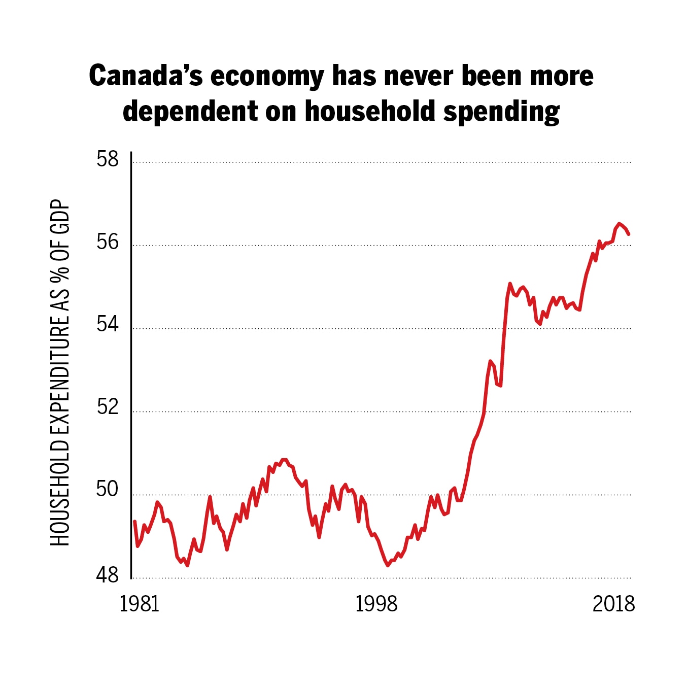 If Canada produced more goods to bolster exports to foreign countries, the last chart wouldn’t be as devastating to the overall economy. Unfortunately, the next charts suggest that severely constricted consumer credit is indeed a big problem for Canada. The first, from Maclean’s, shows us how reliant the Canadian economy had become on consumer spending in the wake of the 2008 recession.