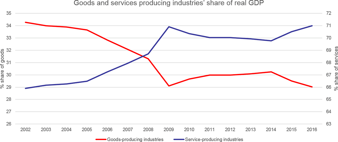 With household spending having been accelerated by the last recession, to well over 50% of GDP, an already overly indebted Canadian consumer looks unlikely to be able to take on such an acceleration after the current recession of 2020. The second chart showing just how dependent Canada has become on the consumer, from Stats Canada, puts into perspective the acceleration in the service industry (blue) in the post-2008 Canadian economy. This does not bode well for the future now that banks seem to be signaling that the Canadian consumer is tapped-out. Goods-producing economic activity (red), would ideally be bolstered if Canada were to recover more quickly from the current pandemic-recession.