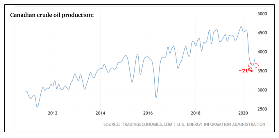 In 2019, over one-fifth of Canada’s exports came from crude oil and related products. The chart below signals danger ahead as Canadian oil production has taken more than a 20% hit in 2020. Adding to the pain is the fact that oil prices have been decimated this year due to a collapse ein demand. Economic shutdowns around the world have exposed an oversupply in oil markets, and the distinct advantage shared by Saudi and Russian producers. Competitors are capable of producing oil at a fraction of the price it costs to bring Canadian crude to market, and thus the demand for Canada’s oil is unlikely to recover quickly. A lack of any viable pipeline project to bring Canadian oil to southern US refineries will also weigh on the sector’s road to recovery.