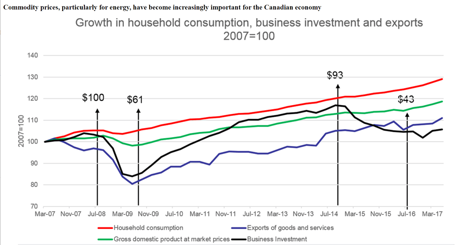The next chart from Stats Canada, below, shows us how Canadian household consumption (red), business investment (black), and exports (blue) all stack up relative to GDP growth (green) since we pulled out of the last recession. This serves to paint a vivid picture of the consumption trap: