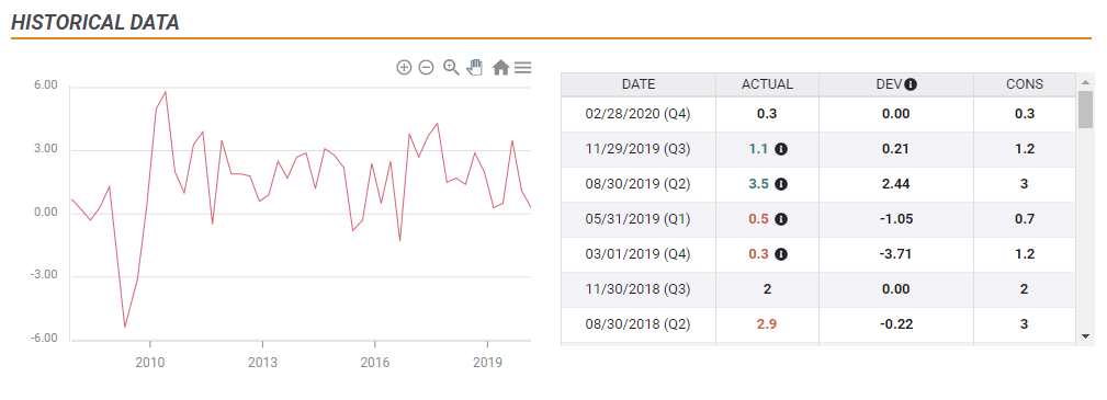 2) Worse than projected: The Canadian dollar will likely come under pressure if the downfall in output is closer to that of the eurozone, which suffered a quarterly decline of 3.8% – around 16% annualized. Such an outcome would show that the shuttering of the economy had a more profound effect on the economy.