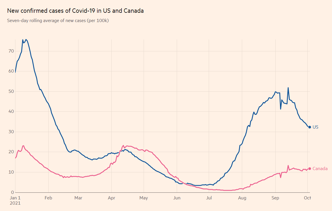 However, each coronavirus wave has a smaller impact on the economy as businesses and employees learn to adapt. Moreover, the last covid wave – of the highly contagious Delta variant – has hit Canada far less than the US. The main reason is the high vaccination rate in Canada, which is in the world´s top.