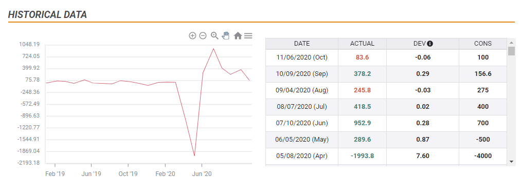 While the chart above shows that most of the most actual figures are in the green, the most recent one disappointed. Another major Canadian data point also fell short of estimates – Gross Domestic Product grew by 40.5% annualized in the third quarter, below 47.6% forecast.