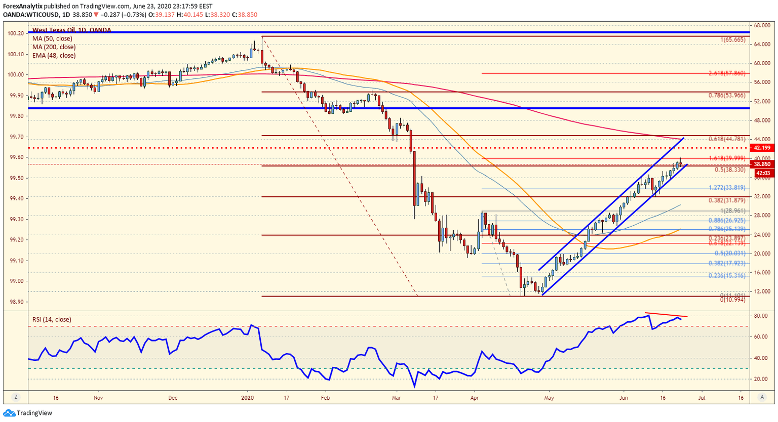 The Crude Oil market hit the 161% Fibonacci Extension of the April highs to lows near the $40 level. We should also note we are just slightly above the 50% retracement of the 2020 highs to lows as well. Today we left a spinning top candlestick, and tomorrow if the market is lower it will be an evening star reversal formation as well. The risk is high since the RSI is divergent and overbought. Bulls are officially on notice!