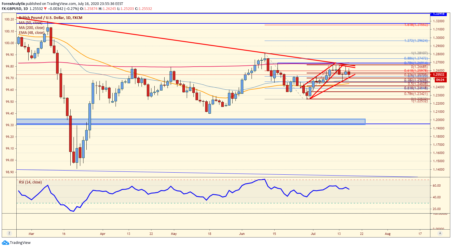 The Cable has had a descent bid and pullbacks have been fairly minor as of late. With the EURUSD hovering at breakout points, the Cable should get some love and attention too. If the EU meeting over the weekend is favorable, it would usher in some USD weakness by default (EURUSD bullish) and the GBPUSD could see a move to the 200dma and key resistance (trend line from end of 2019 and early July highs) at the 1.2680/1.2700 level. A break of this resistance could put the 1.2960 127% extension in play fairly quickly.