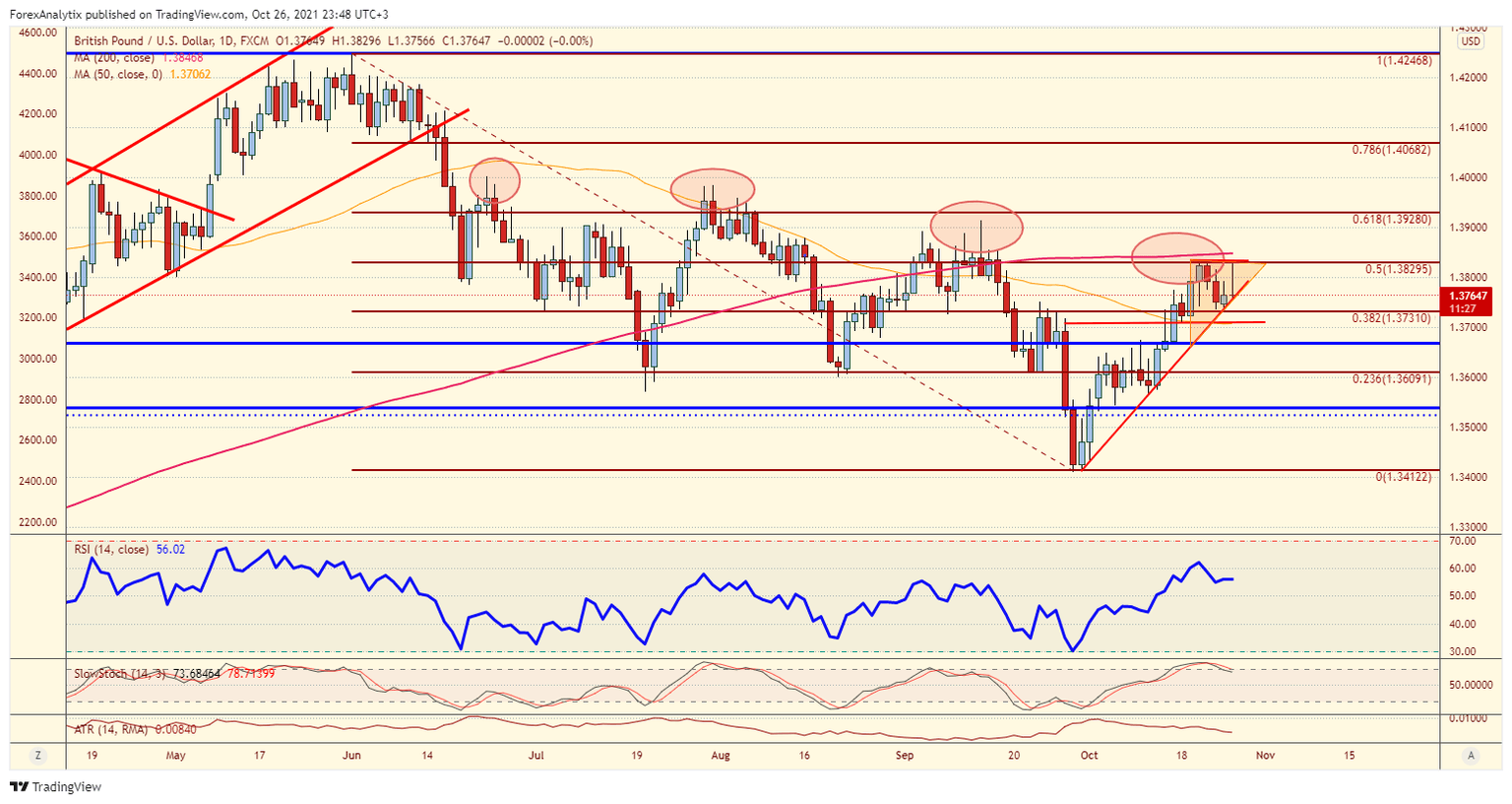 As North American traders stepped in today, the Cable looked set to challenge the 200dma and recent highs at 1.3830, then the pair was slammed down into North American trade. This keeps the 1.3830-1.3850 levels as critical resistance. But the ascending trend line formed from September 30th has come back into view and a move below the 1.3700 level would be very disappointing for the pair. Also take note, since the end of May the pair has been putting in lower highs which is a risk to any bullish view near term.