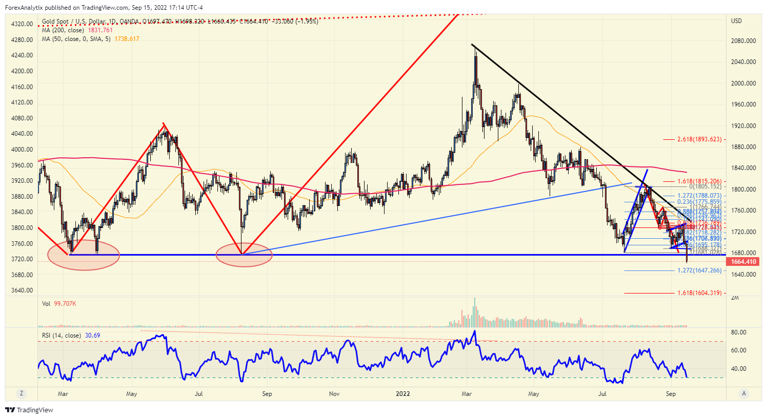 Gold is trading below the key support that has held since March of 2021. The issue here is that gold has not gone higher, despite the market being very bullish gold (and calling for higher prices) for a very long time. While we trade below the 1700 level, the risk is for a move to the 1647 level, then the 161% extension of the last major move higher this summer at 1604.
