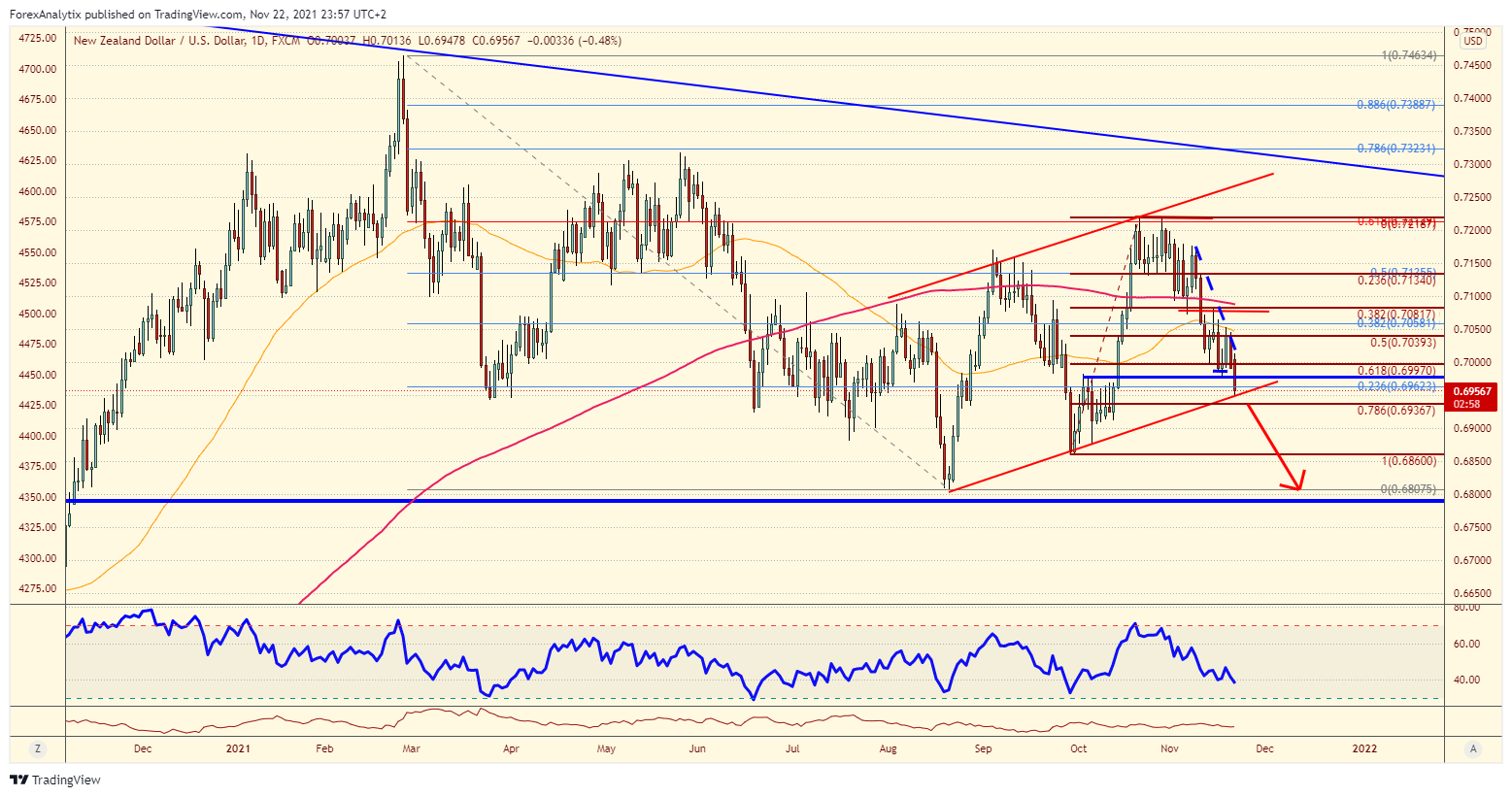 The NZD/USD Kiwi is facing some support as we are at the channel at .6950 following the re-nomination of the Fed Chair, Jay Powell. The risk is that the USD (which had a significant rally and hitting a new 2021 high today) could rally against the NZD strongly if this confluence is broken. The NZDUSD has been trading heavy in recent weeks but the .6936 78% Fibonacci retracement of the Sept lows to Oct highs could allow for a move back to the .6860 and possibly the .6800 key support in the week(s) ahead.
