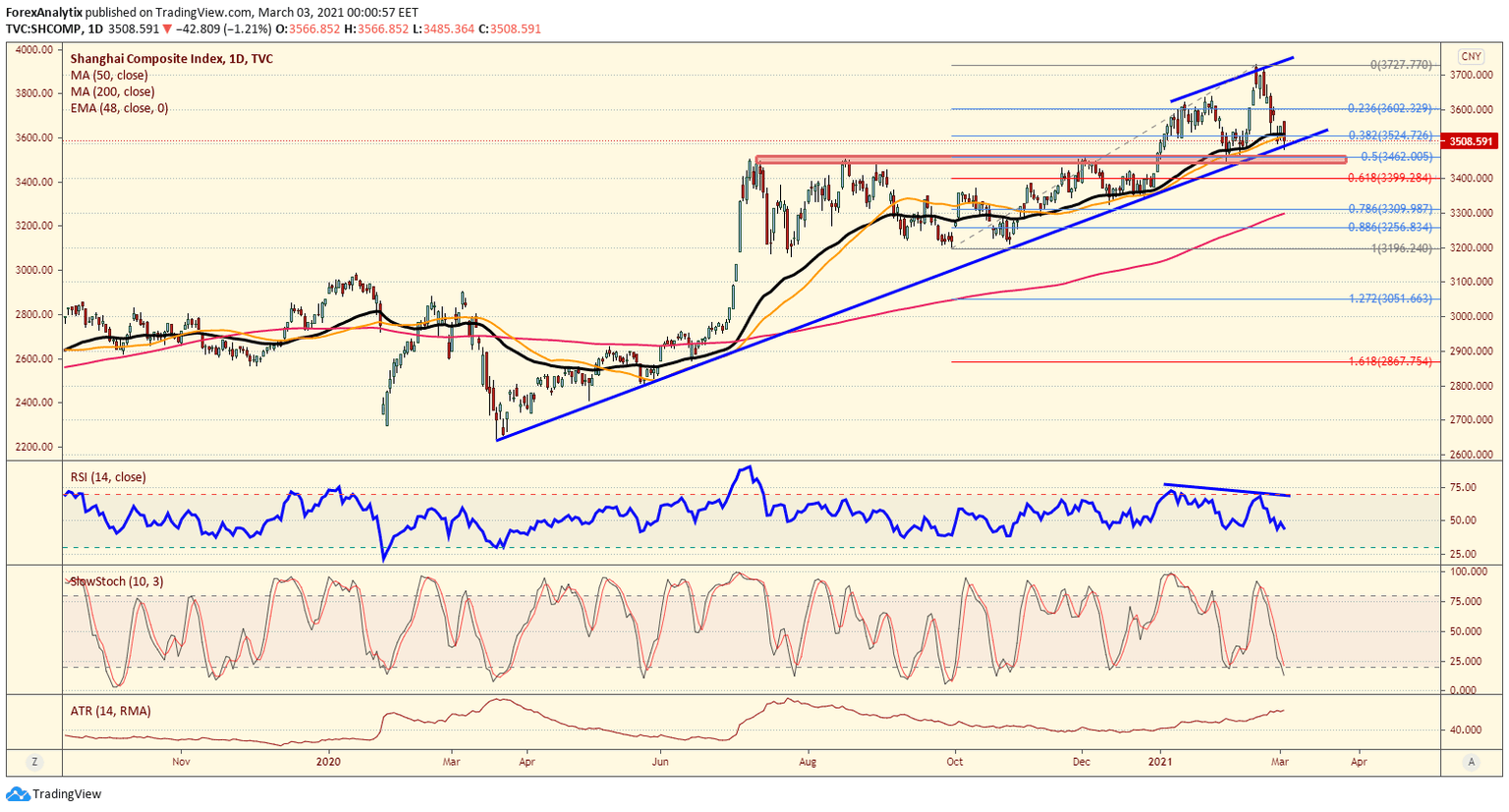 One of the pillars of risk appetite globally has been the rally we have seen in equity markets around the world the last year. The Shanghai composite's chart if a great representation of a strong rally since spring of last year. last week and today the composite is testing an ascending trend line near the 3500 level after coming off 52 week highs a couple weeks back with a divergent daily RSI reading. There is a "support zone" at the 50% retracement at 3462 and slightly below at 3442 which bulls should be watching carefully. The risk is a break of this trend line and the 50% retracement could lead to a deeper pullback towards the 200dma near 3300 and could put some pressure on other global market indices.
