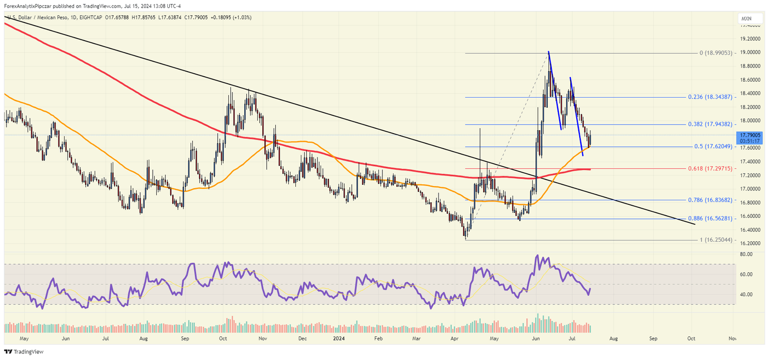 The USDMXN is finding some support at the 50% retracement of the April 2024 lows to June 2024 highs at 17.6200. This is also where the 50dma resides as well. In order to complete an AB=CD move we thought the risk may be back towards 17.4800, however a move back above previous support at 17.8700 which is the June 24th lows would suggest we are ready to make a move back towards the 19.00 level.
